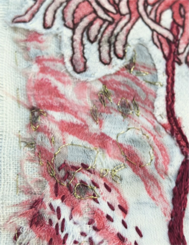 So here’s my first creative piece for the Sacred Mile Project, a bit of embroidery showcasing the creation of something new and (I think) beautiful from something cast aside and damaged. Something literally pulled out of the mud, cleaned off, and re-made. I’ve loved every minute of working with this castoff blouse, and I hope they’re enjoying themself as much as I am.