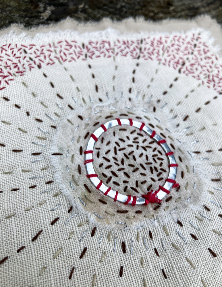 As soon as I affixed the first piece – what seems to have once been a little ring of metal, now broken in one spot and flattened by something – I felt a sort of hum coming from the found item, a hum that intensified the longer I stitched. I used scraps of fabric from a cotton sheet and a big piece of fabric that might be linen, or a blend of cotton and linen, that once hung over a window in our house (though I don’t think it was ever meant to be a curtain). I stitched with some new and some vintage thread. And I found the process soothing. Not only because stitching is always soothing to me, but because making art with this tiny forgotten piece of metal felt like setting something right, like healing one tiny hurt in the world. Or, perhaps, healing two tiny hurts: my own hurt at witnessing yet another careless act of littering, and the hurt of this small being who was cast away. Have you ever felt the joy of a human-made creation when it is loved and treasured? It can be hard to detect in our loud, distracting world but if you open yourself up to the experience, it’s unexpectedly sweet. The joy of someone lost, now given a new home, new love, new beauty, is even sweeter.